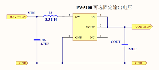 PW5100 的工作頻率高達 1.2MHz,其目的是為了能夠減小外部的電感尺寸和輸出電容容值,故 PW5100 只需要 1uH 以上的電感就可以保證正常工作,