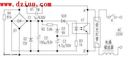 電感鎮(zhèn)流器的作用,在熒光燈管兩端產(chǎn)生高壓將熒光燈點(diǎn)亮。熒光燈點(diǎn)亮后,燈管兩端A' B'間的電壓會(huì)降低到50V(6W)至108V(40W),此電壓再經(jīng)阻容降壓和分壓后便使其整流后的電壓更低,