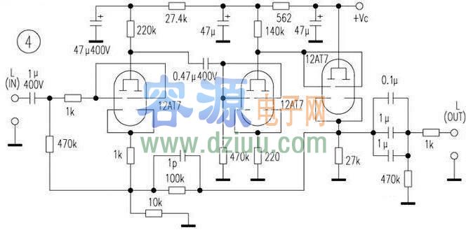。該線路用12AX7作兩級放大,后接12AU7陰級跟隨器