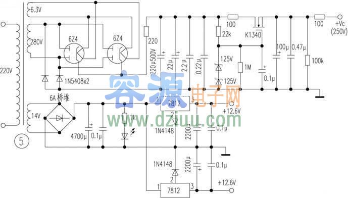 圖5是一款簡單易制、性能出眾的膽機(jī)穩(wěn)壓電源。該線路結(jié)合了電子管與晶體管的特點(diǎn),取長補(bǔ)短,