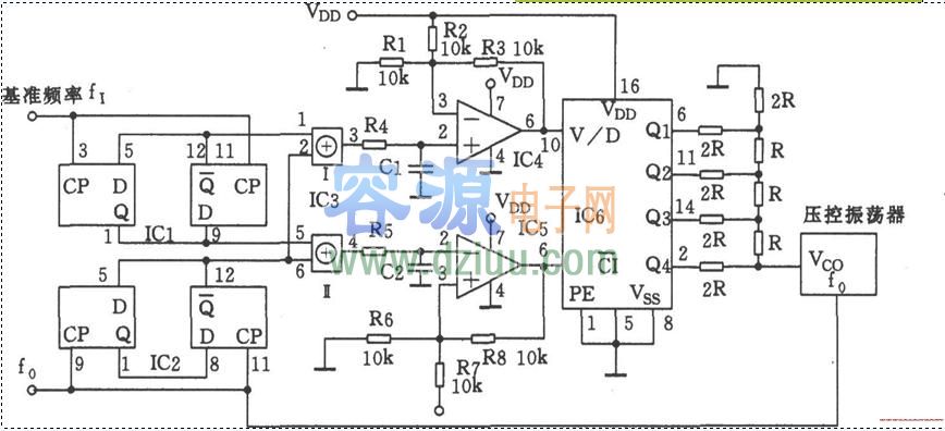 本電路的主要作用是把分相器和數(shù)/模轉(zhuǎn)換器結(jié)合起來,可使高穩(wěn)定度的壓控振蕩器與外部的基準頻率精確地同步 <<版權(quán)聲明:本文由容源電子網(wǎng)(www_dziuu_com)整理提供,部分內(nèi)容來源于網(wǎng)絡(luò),如有侵犯到你的權(quán)利請與我們聯(lián)系更正。》