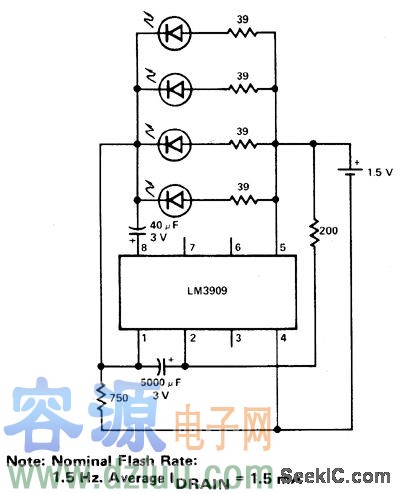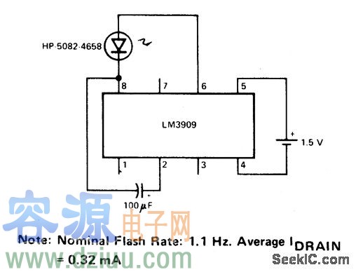 LM3909是一款單片振蕩器,專用于驅(qū)動發(fā)光二極管LED。當工作在1.5V或更低電壓時,可利用電容進行自舉電壓的提升,把2V以上的脈沖信號送至發(fā)光管。因此,巧用這款振蕩器可設計多種實用電路或玩具。