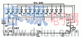 如圖是聲光電子轉(zhuǎn)盤電路原理圖。IC是用于抽獎品等電子游戲玩具或裝置中的專用集成電路,它可驅(qū)動13只發(fā)光二極管和一只蜂鳴器同時工作。 其具體工作原理是:當按下SB鍵后,會有嗒嗒的聲音,此時D1~D13依次點