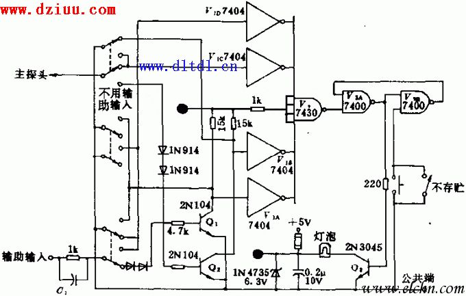 本電路可檢測(cè)二進(jìn)制電平和脈沖的重合性。由開關(guān)晶體管Q3進(jìn)行驅(qū)動(dòng)的指示燈很亮。當(dāng)把