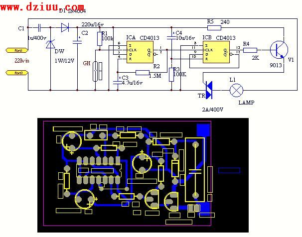 電路工作原理:門控開關電路如下圖,電路采用D型觸發器CD4013組成開關記憶電路,IC-A接成單穩態電路,IC-B接成雙穩態電路。GH為常開型干簧管,平時門關閉時GH閉合,。開門時,GH斷開,IC-A的Q1端輸出高電平觸發IC-B,使Q2輸出高電平,雙向可控硅導通,燈亮,IC-A的單穩時間由R2,C3的數值決定,圖中元件數值的單穩時間為7秒,在