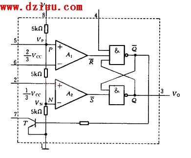 (1)分壓器 由三個5kΩ的電阻串聯組成分壓器,其上端接電源VCC(8端),下端接地(1端),為兩個比較器A1、A2提供基準電平。使比較器A1的“+”端接基準電平2VCC/3(5端),比較器A2的“-”端接VCC/3。