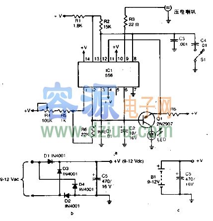 該裝置能發(fā)射超聲波,其頻率范圍為25KHz~65KHz.556電路為雙時(shí)基電路,其中第一個(gè)時(shí)基電路