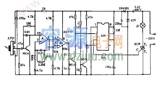 555構成單穩電路,D是受控照明燈。BCR是雙向晶閘管,受555輸出控制。《版權聲明:本文由www.mnu8.com整理提供,部分內容來源于網絡,如有侵犯到你的權利請與我們聯系更正。》