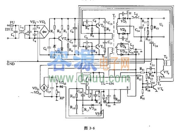 TL494構成半橋式脈沖調寬開關電源原理圖《版權聲明:本文由容源電子網(www_dziuu_com)整理提供,部分內容來源于網絡,如有侵犯到你的權利請與我們聯系更正。》