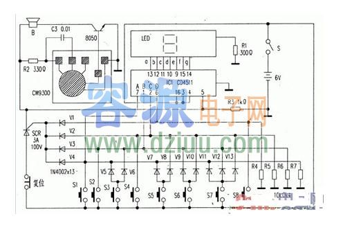 當按下復位鍵時。可控硅被切斷電源而截止,IC1的控制端則由高電平轉變為低電平而清零。為下一次搶答做準備。 <<提示:容源電子網為廣大電子愛好者提供電路圖專題網站“容源電路圖網”,歡迎訪問。匯聚大量電路圖與你共同分享!