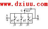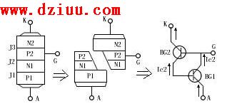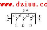的管芯都是由P型硅和N型硅組成的四層P1N1P2N2結構。見圖1。它有三個PN結(J1、J2、J3),從J1結構的P1層引出陽極A,從N2層引出陰級K,從P2層引出控制極G,
