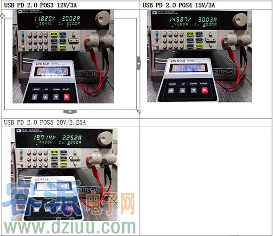 1.3、在5V/3A、9V/3A、12V/3A、15V/3A、20V/2.25A五個PD輸出檔位,分別拉載最大的電流,測試其在不同檔位下輸出的電壓和輸出功率。