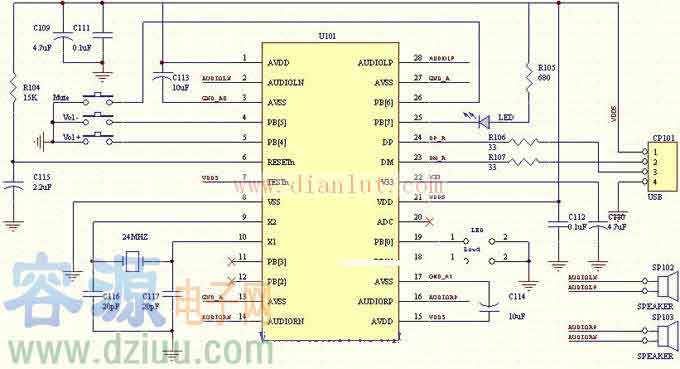 MK909D的USB音箱電路采用最新的USBDAC芯片,支持USB1.1以及USB2.0接口。內建64級音量控制,并有記憶功能;支持三種音量調節方式(A)輕觸按鍵;(B)電位器;(C)編碼器。支持輸出靜音功能,48K的DA采樣,內建