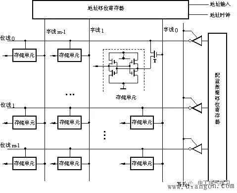 編程數(shù)據(jù)存儲單元以陣列形式分布在FPGA中,編程數(shù)據(jù)存儲單元陣列結(jié)構(gòu)如圖1所示。存儲單元為5管SRAM結(jié)構(gòu), 只有一根位線。其中T管為本單元控制門,由字線控制。數(shù)據(jù)以串行方式移入移位寄存器,而地址移位寄存器順序選中存儲單元的一根字線,當(dāng)某列字線為高電平時, 該列存儲單元的T管導(dǎo)通,從而與位線接通,在寫信號控制下將數(shù)據(jù)移位寄存器中一個字的數(shù)據(jù)通過各列位線寫入該列存儲單元。