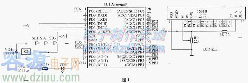 電子密碼鎖主要由單片機ATmega8、液晶顯示器LCD1602和電磁鐵鎖芯等部分組成。實驗板上與電子密碼鎖有關的電路部分見下圖。圖中SB1、SB2、SB3為輸入按鍵,用于輸入數字密碼。VD6、R7、VT4等組成電磁鐵驅動電路,由ATmega8的PD7腳進行控制,實際使用時只要將VT4的負載由繼電器換成電子密碼鎖的電磁鐵吸合線圈即可,當然也可以用繼電器的常開觸點去控制電磁鐵吸合線圈。
