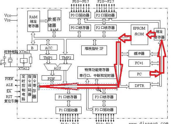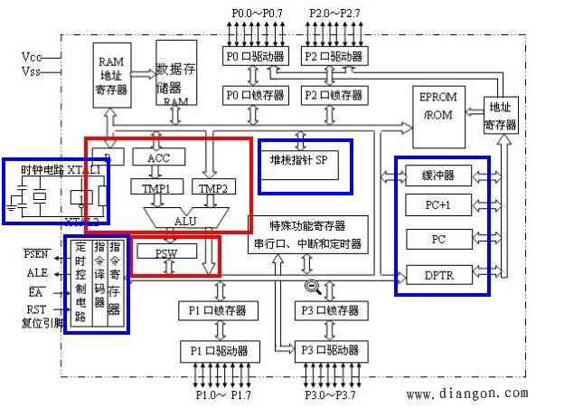 內(nèi)部的結(jié)構(gòu)看似十分復(fù)雜,但是大致上可以分為兩個部分:運算器(紅色框)和控制器(藍色框)。