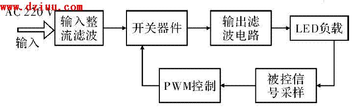 可以做到80% ~90% 。該類電路都有完善的保護措施,屬高可靠性電源。PWM 開關電路由4 部分組成,即輸入整流濾波、PWM 控制、開關器件和輸出濾波。根據(jù)PWM 方式開關電路設計的LED 驅(qū)動電路框圖如圖1