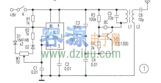 外圍元件構(gòu)成晶體穩(wěn)頻電容三點(diǎn)式振蕩器,諧振頻率27.145MHz。VT1振蕩產(chǎn)生的高頻載波經(jīng)555③腳輸出的方波信號調(diào)制,由天線發(fā)射出去。 <<版權(quán)聲明:本文由容源電子網(wǎng)(www_dziuu_com)整理提供,部分內(nèi)容來源于網(wǎng)絡(luò),如有侵犯到你的權(quán)利請與我們聯(lián)系更正。》