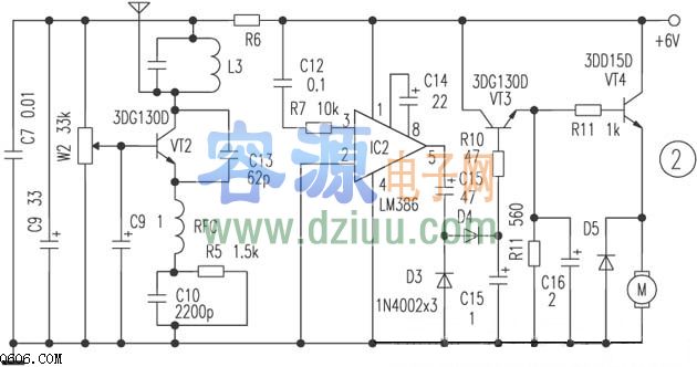 外圍元件構(gòu)成超再生檢波器,檢出原方波調(diào)制信號,經(jīng)C12、R7送至IC2的③腳,放大后的信號經(jīng)D3、D4倍壓整流,由VT3射隨器輸出其平滑后的直流電壓。該電壓的大小與發(fā)送的不同占空比信號波形有關(guān)。 <<版權(quán)聲明:本文由容源電子網(wǎng)(www_dziuu_com)整理提供,部分內(nèi)容來源于網(wǎng)絡(luò),如有侵犯到你的權(quán)利請與我們聯(lián)系更正。》
