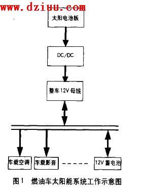 的部件主要是一個太陽電池板與一個DC/DC變換器。燃油車太陽能系統(tǒng)工作示意圖如圖1