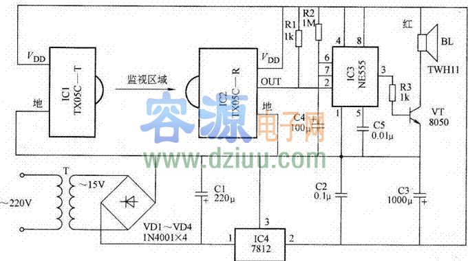 ,其電路主要由紅外發射和接收模塊、時基集成電路、報警揚聲器及電源電路幾部分組成。 《版權聲明:本文由容源電子網(www_dziuu_com)整理提供,部分內容來源于網絡,如有侵犯到你的權利請與我們聯系更正。》
