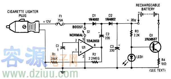 12Vdc移動電池充電器電路圖可以從12V汽車電源提供高達20 V的輸出,允許對NiCad電池單元進行恒定電流充電,最大電壓為18 V.
