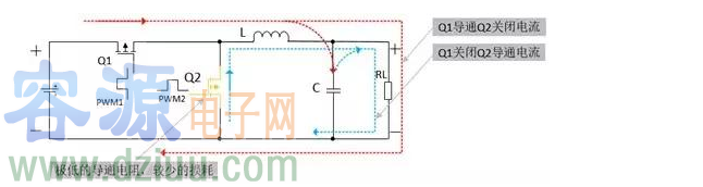 上述第二階段續流二極管D導通會消耗一部分的電能,如果用導通電阻極小的MOS管Q2取代二極管D將有效降低續流過程中的損耗,提高效率,尤其是在大電流輸出DCDC電路中更甚。Q2的開關動作要配合Q1實現二極管的整流作用,這個配合過程叫同步,因此同步DCDC就這么得來了,上述用二極管整流的就叫做非同步DCDC。