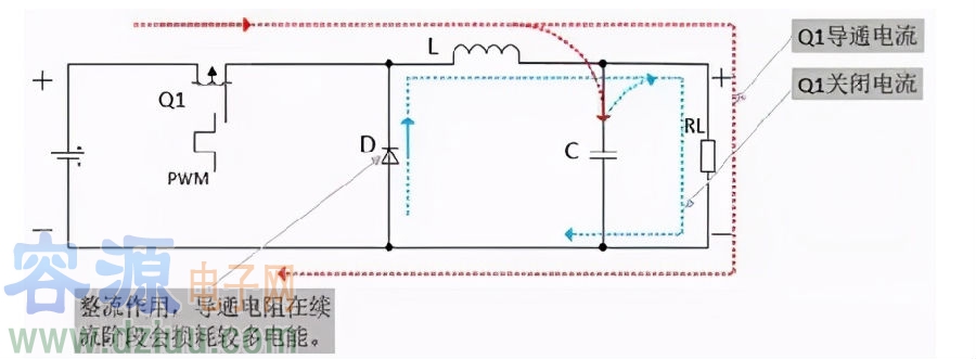 以buck電路為例子,Q1為PWM驅動的MOS開關管。階段Q1導通,電流路徑如圖中紅色標注,此時左側電源根據Q1對電感L和電容C充電儲能并對右側負載RL做功,二極管D是反向截止的。第二階段Q1關閉,電流路徑如圖中藍色標注,此時左側電源開路不對后級控制電路供電,但電感L和電容C中儲存的磁場和電勢根據續流二極管D形成閉合回路并對負載RL做功。調整PWM占空比即可在輸出端得到電源的降壓輸出。