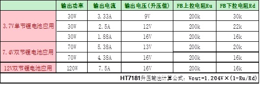 單節(jié)/雙節(jié)/三節(jié)鋰電池應用升壓輸出電壓/電流/功率以及對應FB管腳設置電阻值: