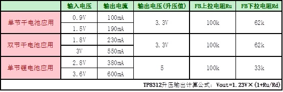 TP8312應用于單節(jié)干電池1.5V、雙節(jié)干電池3V、單節(jié)鋰電池3.7V升壓典型參數如下: