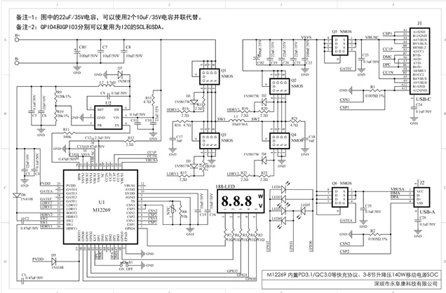 深圳市永阜康科技有限公司現在順勢推廣一顆支持PD3.1/QC3.0等主流快充協議、3-8節升降壓型140W鋰電充放電管理SOC-M12269。 該芯片是一款面向3-8串電芯大功率移動電源應用的專用SOC,集成了同步升降壓電壓變換器、電池充放電管理模塊、顯示模塊、電量計算模塊,提供最大140W輸入/輸出功率,支持 PD3.1、QC3.0、AFC、FCP、 SCP、BC1.2 DCP 等主流快充協議,并提供過壓/欠壓、過充/過放、過溫等完備的保護功能。封裝形式采用QFN-48(6.0×6.0mm,0.5mm pitch)。配合簡單的外圍電路,即可組成大功率單路多口(C+A+A)移動電源管理方案。