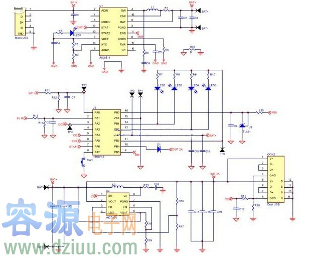 隨著移動(dòng)設(shè)備的增多,移動(dòng)設(shè)備對(duì)電池續(xù)航要求也不斷提高,在移動(dòng)設(shè)備電量不足的情況下,移動(dòng)電源成為人們首先產(chǎn)品,移動(dòng)電源應(yīng)用非常廣泛,要對(duì)移動(dòng)電源不斷要求的情況下,移動(dòng)電源電池管理電路成為控制單元的核心部件,下面介紹一款移動(dòng)電源電路圖:
