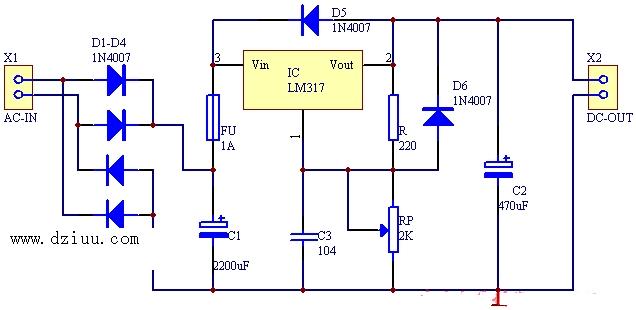 穩(wěn)壓電壓值。D5,D6用于保護LM317。