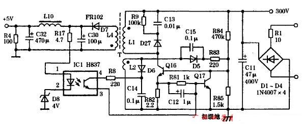 隔離電路.以防止輸入Q17的穩(wěn)壓控制信號(hào)被R82所短路。光耦器IC1和Q17又構(gòu)成振蕩抑制型(又稱RCC型)穩(wěn)壓控制電路.RCC的特殊之處是通過(guò)抑制自激振蕩的過(guò)程改變開關(guān)管導(dǎo)通/截止的占空比穩(wěn)定輸出電壓,而不是控制每個(gè)振蕩周期正程的脈寬。