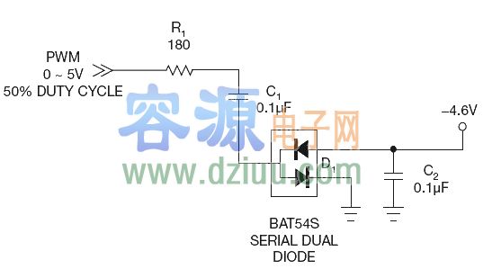 ,用一只BAT54S雙串聯(lián)肖特基二極管、兩只電容以及一只限流電阻構(gòu)成的PWM電壓轉(zhuǎn)換器就可以提供負(fù)電壓(圖1)。 <<版權(quán)聲明:本文由容源電子網(wǎng)(www_dziuu_com)整理提供,部分內(nèi)容來(lái)源于網(wǎng)絡(luò),如有侵犯到你的權(quán)利請(qǐng)與我們聯(lián)系更正。》