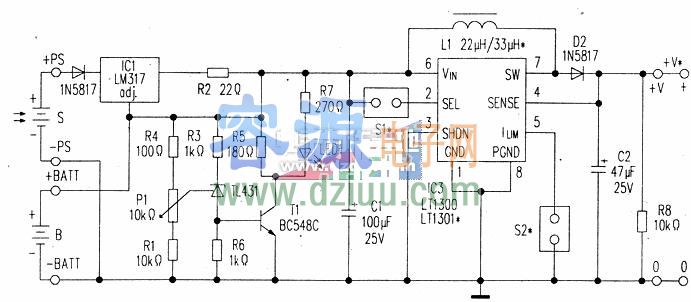 電流到地,LED1發光,防止過充電的發生。穩壓器IC3的輸出電壓、電流與選用型號(LT1300或LT1301)和跳線接口S1與S2