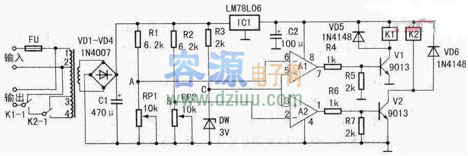 A1、A2為運算放大器,在這里作電壓比較器用;IC1為三端穩壓塊,為運算放大器及繼電器提供供電電源;VD5、VD6為保護二極管。 <<版權聲明:本文由容源電子網(www_dziuu_com)整理提供,部分內容來源于網絡,如有侵犯到你的權利請與我們聯系更正。》