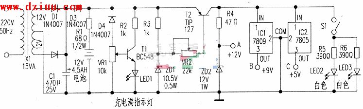“B”和“C”端分別經(jīng)穩(wěn)壓芯片IC1和IC2提供9V和5V。LED2和LED3是兩只超亮白色LED.用于應(yīng)急照明,R5、R6分別為限流電阻。 <<版權(quán)聲明:本文由容源電子網(wǎng)(www_dziuu_com)整理提供,部分內(nèi)容來源于網(wǎng)絡(luò),如有侵犯到你的權(quán)利請與我們聯(lián)系更正。》
