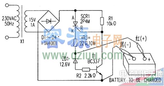 這是一種簡單、自動化的電池充電器,它由可控硅2P4M(SCR1)、晶體管BC337(T1)、齊納二極管ZD1和少量分立元件組成。 <<版權聲明:本文由容源電子網(www_dziuu_com)整理提供,部分內容來源于網絡,如有侵犯到你的權利請與我們聯系更正。》