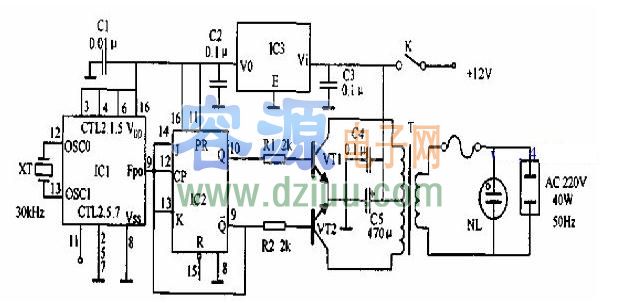 在該電路中,IC1產(chǎn)生準(zhǔn)確的100Hz脈沖,經(jīng)IC2 JK觸發(fā)器二分頻變成50Hz方波,并驅(qū)動功率管VT1和VT2交替導(dǎo)通變成50Hz方波,再經(jīng)變壓器T升壓成220V方波輸出。IC3把12V變成+5V做IC1和IC2的工作電源。 <<版權(quán)聲明:本文由容源電子網(wǎng)(www.mnu8.com)整理提供,部分內(nèi)容來源于網(wǎng)絡(luò),如有侵犯到你的權(quán)利請與我們聯(lián)系更正。》