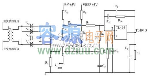 原邊電流越大, 電流取樣變壓器整流出的電壓越大, 電位器RP 中心點電壓越低,TL494: 2 腳電壓隨之下降, 使得TL494: 3 腳電壓升高, 送入脈寬調(diào)制器, 將T L494 驅(qū)動脈沖寬度