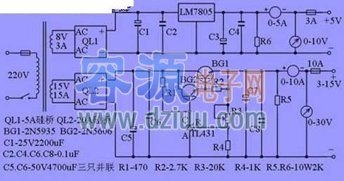 你想把可調電壓范圍擴大,可以改變 R4和 R3的電阻值,當然變壓器的次級電壓也要提高。變壓器的功率可根據輸出電流靈活掌握,次級電壓 15V左右。橋式整流用的整流管 QL用 15- 20A硅橋,結構緊湊,