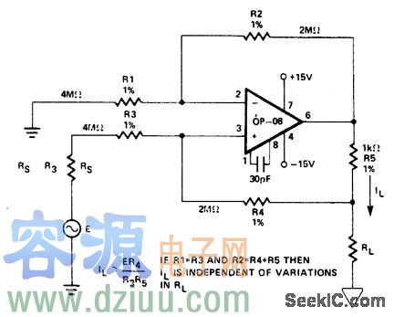 如果經過R5的R1的值只有1%,那么該電路將產生低于2%的電流關系。這種關系包括Rl在100-2000ohm范圍內的變化。當經過R4的R1的電阻很大時,由于Rt變化,誤差將降到最低。大電阻是OP-08的輸入