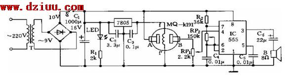 555和R2,RP2,C4組成可控多諧振蕩器。平時,強制復位端4腳處于底電平,555處于停振;當QM型器敏元件檢測到可燃氣體或煙霧時,A—B極間的阻值降低,使4腳電位上升,使得555起振。并通過3腳輸出端驅動蜂嚀器發出報警聲。