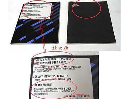 另一個重要標識是在說明書上,如圖2所示,在返修筆記本的說明書上,也有類似的標注,左邊是返修筆記本電腦的說明書,在封面上有關于返修的相關說明,而右邊則是全新筆記本電腦的說明書,封面上沒有這種說明,下面為放大的說明部分,請注意劃圈的幾個地方,上面很清楚的注明了該筆記本內含有使用過的零件,并且保修期為1年。另外在筆記本的包裝箱上也有類似標注的標簽,所以我們在選擇筆記本時也不要忘記檢查這幾個地方,如果發現了此類標簽,即證明該筆記本為返修機。
