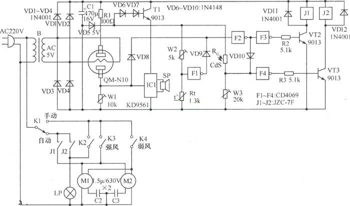 元器件選擇IC1選用KD9561集成電路;F1~F4選用CD4069集成電路。VT1~VT3均選用9013三極管。光敏電阻選用CdS光敏電阻;熱敏電阻選用4只330Ω熱敏電阻串聯(lián)。氣敏傳感器選用QM-N10。其他元器件選用如圖