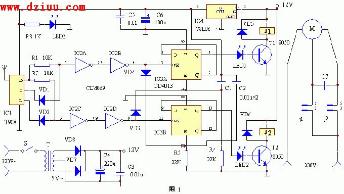 Q(13腳)翻轉輸出高電平,T2導通,J2吸合,電機反轉,窗簾打開。同樣再次按動D鍵,Q(11腳)再次翻轉輸出低電平,窗簾停止運動。如此通過兩鍵可任意實現窗簾的打開、合上、停止,非常方便。