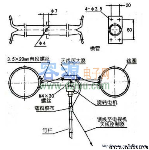 二、組裝兩只線圈,用8注:圖中尺寸單位為mm只M3.5mm×20mm的自攻螺絲固定在橫管兩端,然后再用兩只M3.5mm×20mm的自攻螺絲將天線放大器固定在橫管