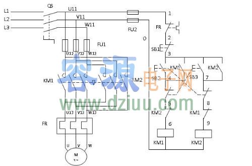 反轉原理:和正轉一樣,當按下SB3時,SB3的動斷開關斷開,KM2線圈得電,繼電器工作,KM2動合開關閉合,電路進入反轉自鎖,KM2動斷開關斷開,當按下SB1時,電路退出自鎖,整個電路停止工作。 <<容源電子網論壇正式上線,為朋友們建立一個友好互動交流平臺,歡迎大家去論壇和朋友們一起分享、學習電子技術。對本文有什么疑問請直接到論壇相應欄目發貼求助。