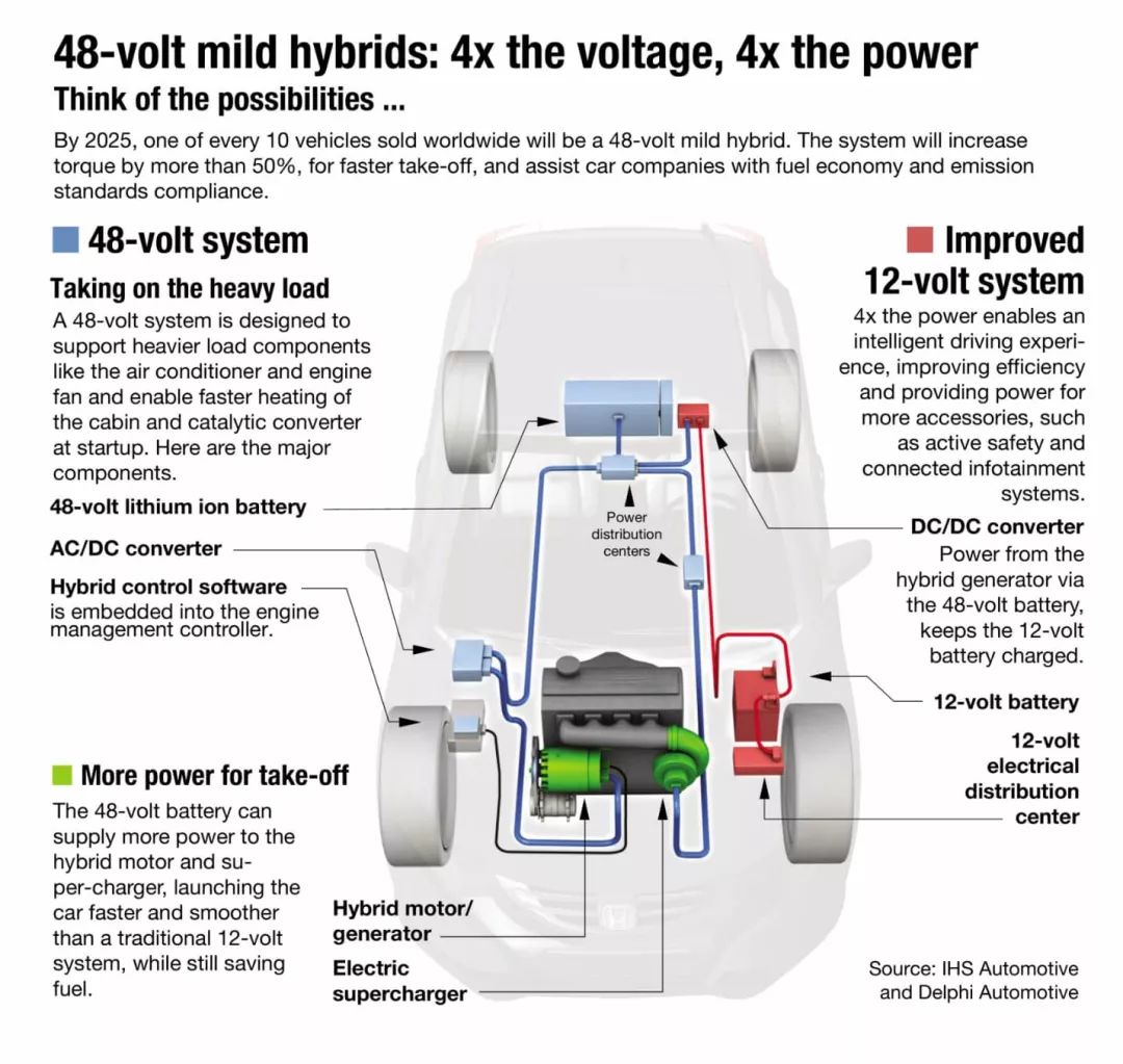 考慮一個(gè)基本組件:發(fā)動(dòng)起啟動(dòng)器,48V電池如何改變發(fā)動(dòng)機(jī)啟動(dòng)器的基本架構(gòu),從而更好的增強(qiáng)啟停效果,這種方式有利于減少在紅綠燈和停車(chē)等待時(shí)的燃油消耗,進(jìn)一步增強(qiáng)燃油效率。在大多數(shù)只有12V電池的汽車(chē)中電池為啟動(dòng)器提供動(dòng)力,交流發(fā)電機(jī)作為充電器,然而48V和12V的組合使用可以提供高達(dá)10KW的功率,啟動(dòng)電機(jī)和獨(dú)立的交流發(fā)電機(jī)被集成的啟動(dòng)發(fā)電機(jī)(ISG)或帶式啟動(dòng)發(fā)電機(jī)所取代,48V鋰離子電池和雙向DC/DC轉(zhuǎn)換器會(huì)被封裝在堅(jiān)固的盒子內(nèi),這其實(shí)是一種弱混動(dòng)力系統(tǒng),與內(nèi)燃機(jī)協(xié)同工作。它可以提供三分之二的好處,但是只有三分之一的成本,而經(jīng)濟(jì)效益增加了15%到20%。